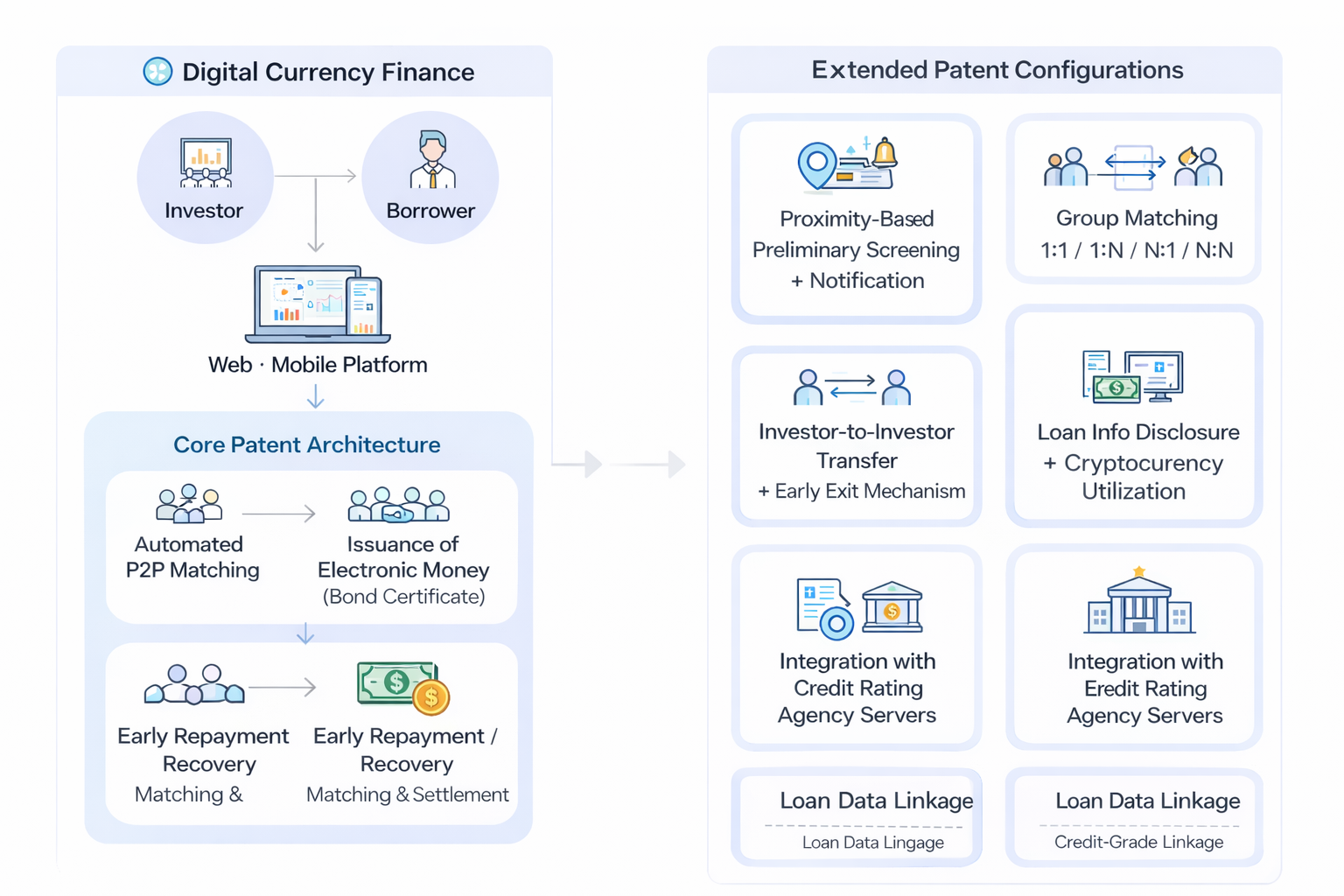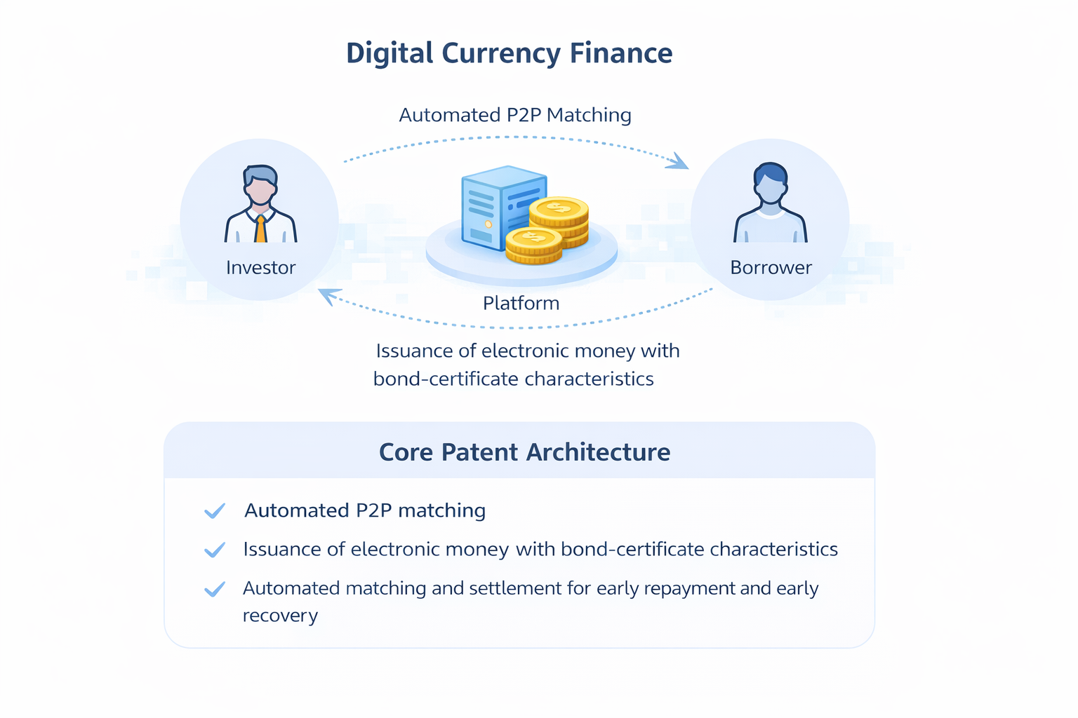 Digital Currency Finance is a technology that, within a P2P investment and lending structure where investor funds are provided to borrowers, enables the platform to issue electronic currency functioning as bond certificates and to automatically handle matching and settlement, including early repayment and early recovery situations.
