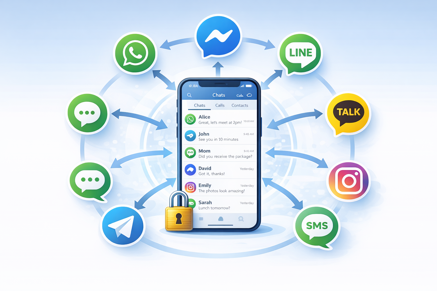 The system consolidates conversation lists, unread message indicators, sorting logic, and security controls across different messengers, while preserving each messenger’s individual account structure.