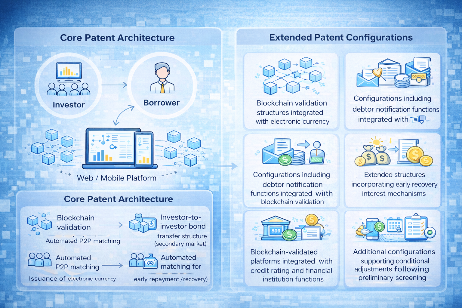 This patent provides an investment-lending platform that verifies and records digital bonds through blockchain validation, ensuring stability and transparency.