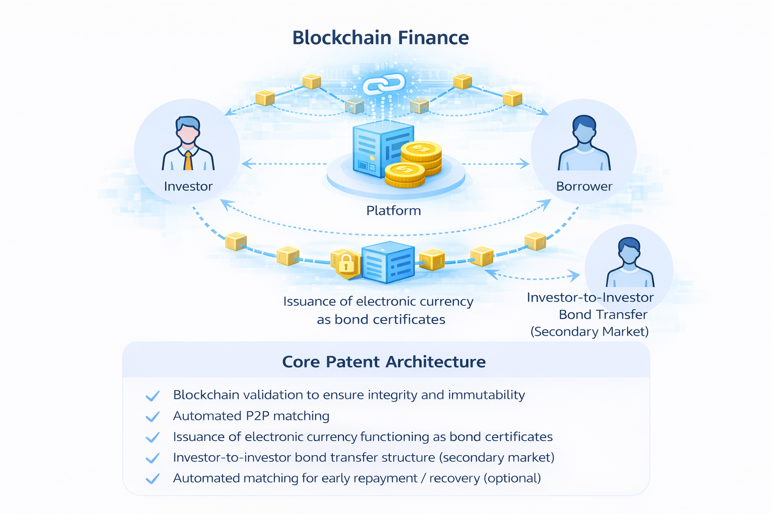 Blockchain Finance is a platform technology in which blockchain validation is a mandatory component. It may be integrated with CBDC operational systems, or implemented within a P2P investment and lending structure where the platform issues electronic currency functioning as bond certificates and verifies such currency through blockchain technology.