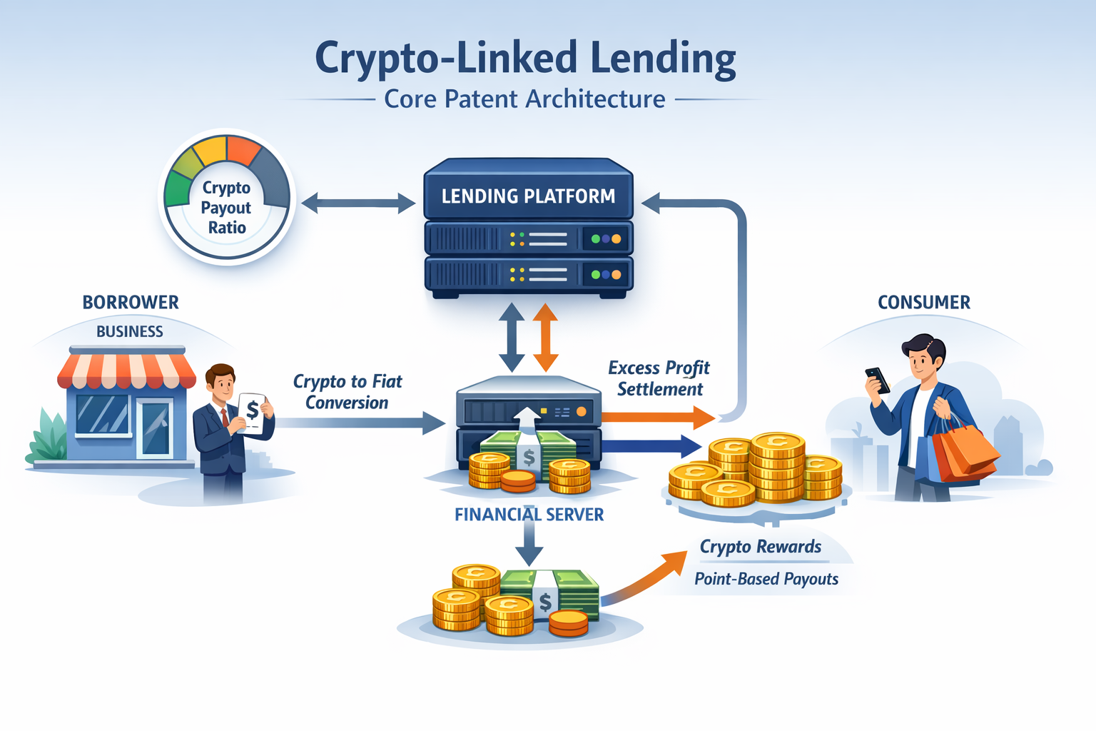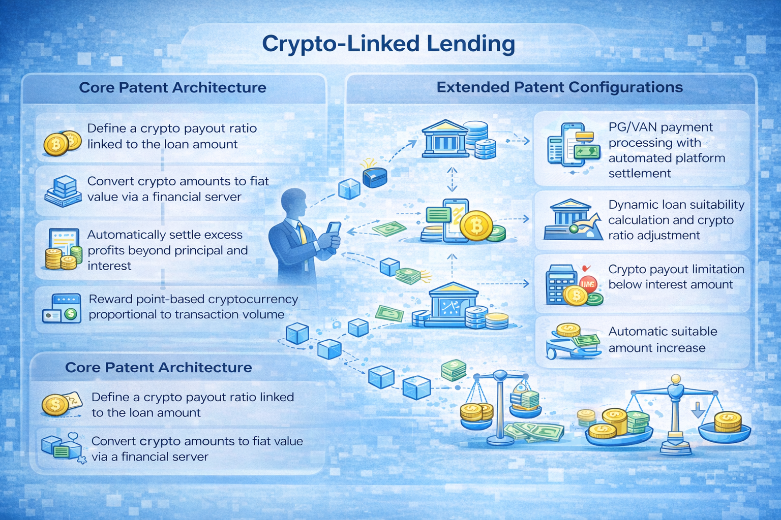 This patent defines a loan-linked cryptocurrency payment rate and enables parallel transfers of cash, cryptocurrency, and point-based cryptocurrency using one or more blockchain networks.