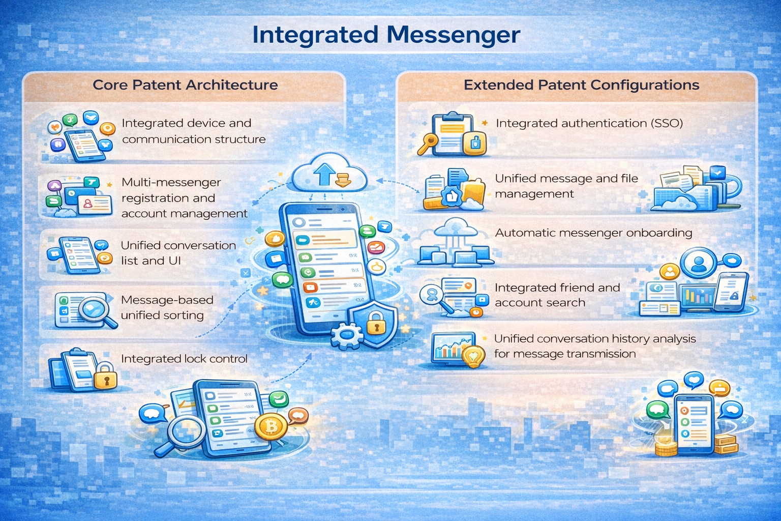 This patent provides a platform that integrates multiple messenger applications, displays unified conversation lists and message indicators, and manages lock settings automatically.